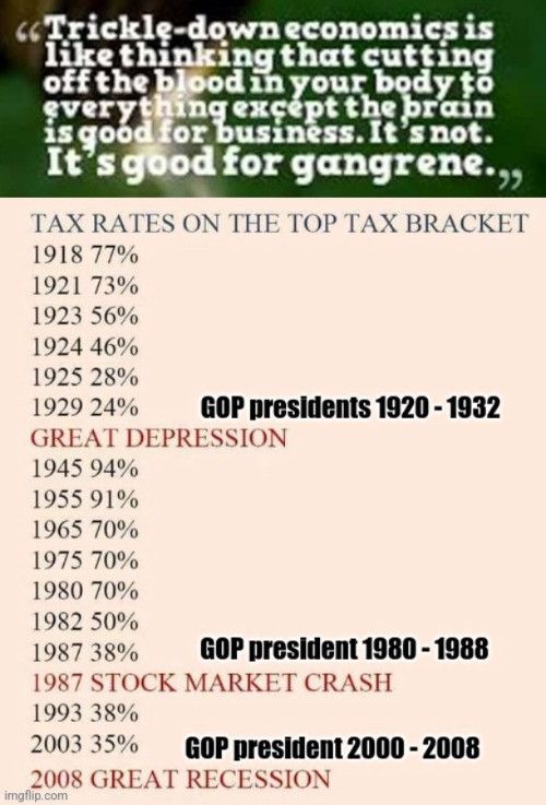 Let us take a crude look at U.S. tax policies over time. In 1918, to pay for WWI, the top marginal income tax rate on this relatively recent method (at that time) for paying our public expenses reached a high of 77%. Then came the ‘normalcy’ of the Republican- dominated roaring 1920s where top public officials asserted that the ‘business of America is business.’ Andrew Mellon, the wealthy Secretary of the Treasury during this decade, believed that government’s prime responsibility was to support the holders of capital while dismissing the concerns of labor.