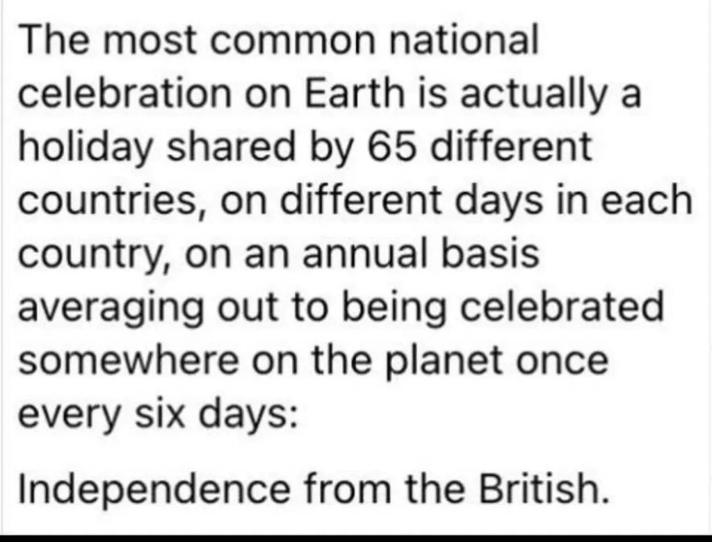 Roughly a week ago, we celebrated our independence from Britain. Of course, we screwed up the significance of that holiday … something we do with surprising regularity. At the time, John Adams predicted that future generations would celebrate our independence on July 2nd. It was on that day in 1776 that the colonial representatives gathered in Philadelphia voted to break with the mother country. That was considered the major event in the moment. The 4th was a relatively minor afterthought when the formality of affixing their signatures to the final version of the declaration of independence took place. But the vote two days earlier was the critical moment.