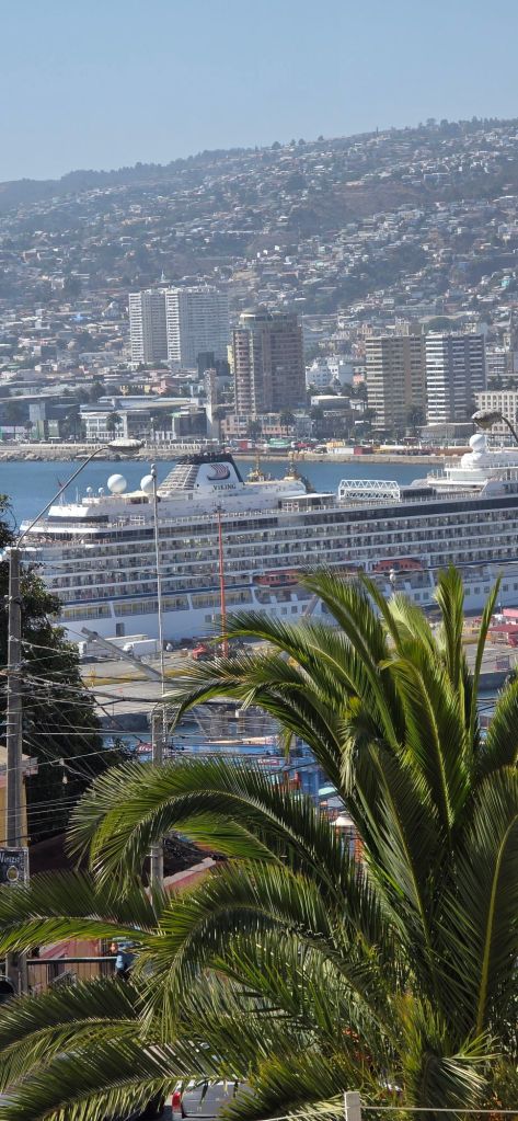 Below is a shot of our ship, the Viking Jupiter, as it lies docked in Valparaiso (Chile). Our final port of call is a quaint city built vertically from the sea. Its patchwork areay of streets are narrow and difficult to navigate. It has the feel of San Francisco but older, more worn, and a bit down on its luck. We were surprised that Santiago, the capital, was yet another 75 miles inland.